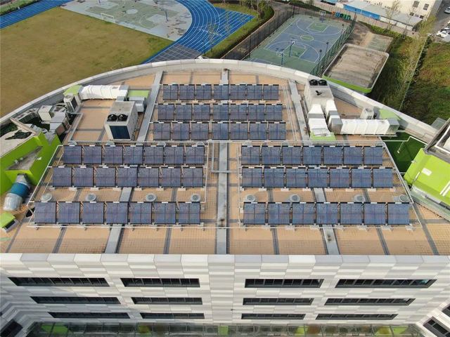 ——室外運動場雨棚屋面由太陽能光伏發(fā)電板組成,既能夠發(fā)電也能夠遮風擋雨。部分屋面也建有真空管太陽能熱水系統(tǒng),太陽能熱水可供廚房使用。