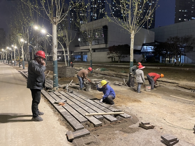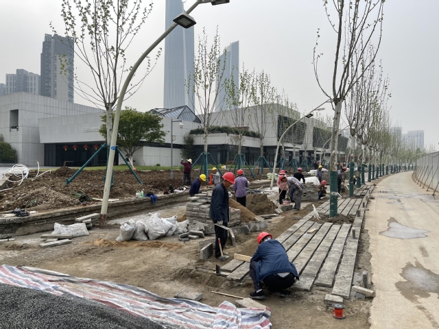 接到4月21日前完成(和園-南京濱江規(guī)劃建設(shè)展示中心段)景觀恢復(fù)的節(jié)點(diǎn)任務(wù)之后,市政公司立即調(diào)整施工計(jì)劃,增加物力支持,加大投入機(jī)械設(shè)備進(jìn)場(chǎng)量,確保高質(zhì)高效施工,穩(wěn)步推進(jìn)工期進(jìn)度。同時(shí),組織施工隊(duì)伍連夜施工,逐一確定施工材料供貨節(jié)點(diǎn)。施工結(jié)束后當(dāng)天及時(shí)復(fù)盤(pán),并按進(jìn)度調(diào)整次日工作計(jì)劃。