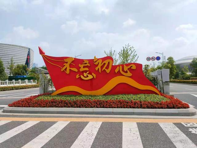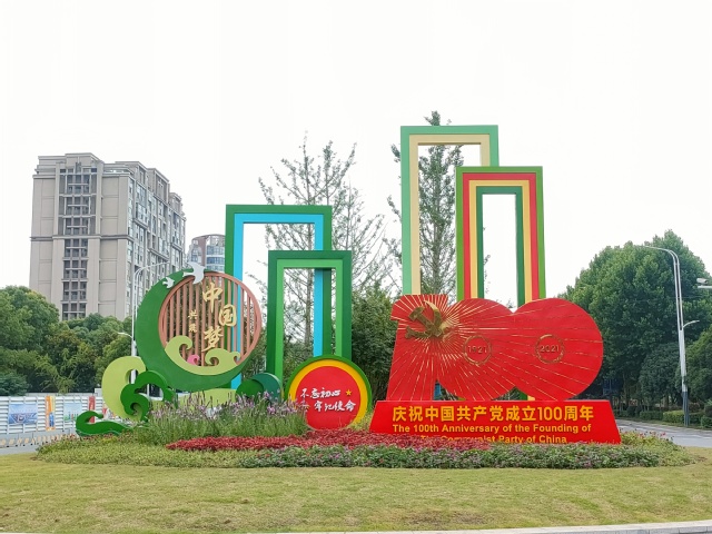 不忘初心來時路,同心共筑中國夢。位于建鄴區(qū)夢都大街揚子江大道路口高7米,占地面積100余平方米的主題景觀,在綠地基礎(chǔ)上突顯了“慶祝中國共產(chǎn)黨成立100周年”活動標識等黨建元素;中國傳統(tǒng)紋樣圖案、彩色立體門框的設(shè)計,賦予整件作品立足傳統(tǒng)、開放包容的內(nèi)涵;蛇鞭菊、斑葉芒、彩葉草、夏堇等各式花卉錯落有致的鋪滿地面,烘托了喜迎建黨百年的喜慶氛圍。