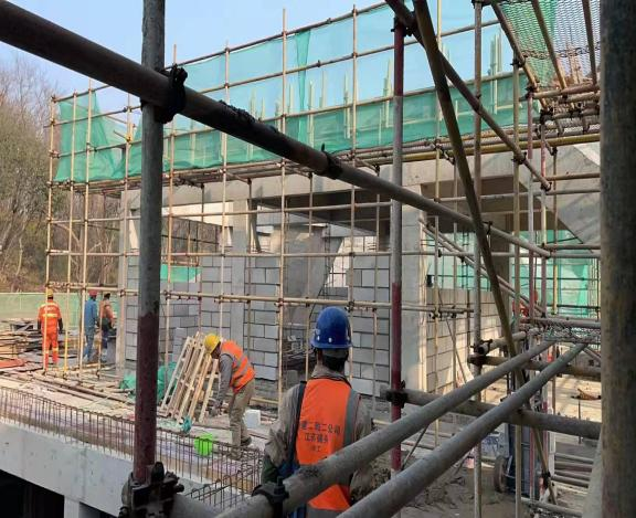 在紫金山莊配套設(shè)施擴(kuò)改建項(xiàng)目現(xiàn)場,聽到的是機(jī)器轟鳴、車輛喧囂的聲音,看到的是工作忙碌、干勁十足的景象,工人們正加緊二次結(jié)構(gòu)的施工。