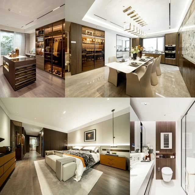 此次公開的樣板間為265㎡奢華四房兩廳三衛(wèi)雙陽臺戶型,在戶型研發(fā)和飾面材料使用上,設(shè)計(jì)團(tuán)隊(duì)都針對主要客戶人群的需求,經(jīng)過反復(fù)斟酌,對細(xì)節(jié)處理更是精益求精,成為奧體公司迭新之作。硬朗的石材紋理與沉穩(wěn)的木飾面碰撞出豐富的層次變化,加上墻面局部銅制捶打紋飾面和內(nèi)嵌式金屬開關(guān)面板,營造低調(diào)奢華的現(xiàn)代風(fēng)格。