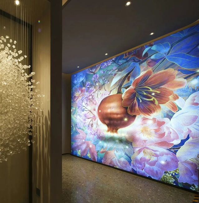 “人間歡喜事,石榴成熟時(shí)”,藝術(shù)生活館中一幅瑰麗絢爛的手繪花神圖渲染出主題氛圍,鮮花簇?fù)眍w粒飽滿石榴的畫幅,姹紫嫣紅中,將奧體公司開發(fā)的奧體新城各小區(qū)名稱中的植物元素有機(jī)組合在一起,觀眾置身其中,仿佛能聞到花的芳香、看到石榴籽的晶瑩剔透。畫面寓意著花開興隆、興旺昌盛,祝福幸福美好生活紅紅火火,也體現(xiàn)了河西集團(tuán)“開發(fā)幸福、運(yùn)營美好”的經(jīng)營理念。整幅花神圖由特邀手繪師親繪而成,十分珍貴。